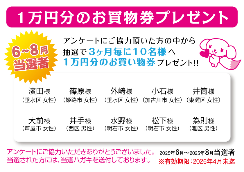 【アンケート当選発表 2025年6月~8月回収分 1万円分お買物券】神戸三宮 センター街 さんプラザ3階 さんプラザコンタクトレンズ カテゴリ:当選者発表 【2025年6月~8月10,000円分お買物券当選者】 当選ハガキをご持参の上、 メガネ・コンタクトレンズ・ケア用品などの ご購入にご活用下さいませ。 << アンケート当選発表一覧に戻る この投稿を共有する: X で共有 (新しいウィンドウで開きます) X Facebook で共有 (新しいウィンドウで開きます) Facebook 友達にメールでリンクを送信 (新しいウィンドウで開きます) メールアドレス 印刷 (新しいウィンドウで開きます) 印刷